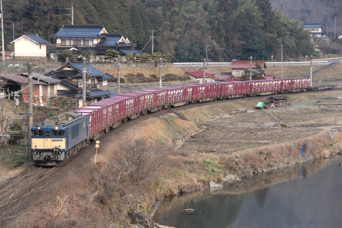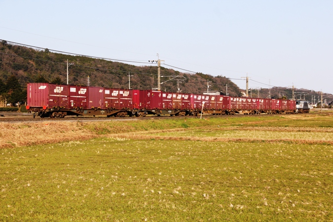 氷見旅行を挟んで2週間後、前回と同じ様に朝早くからエクストレイル君を走らせました。途中、設定した目的地の駅を間違ってた事に気付いて慌てたけど、急いで車を走らせる中で臨時貨物を発見!霜の降りた田圃の横にてエエ感じで撮れました