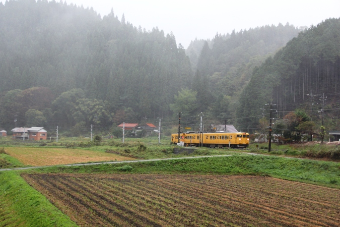 さてさて、空から雨粒が降り注いどうわ、3082レが遅れて取り損ねるわで、出だしから超不機嫌となったけど、石霞渓で気持ちを落ち着かせてから再起動。でも風雨が洒落ならんどぉ〜っ!最初は末期色の二連普通列車から開始!