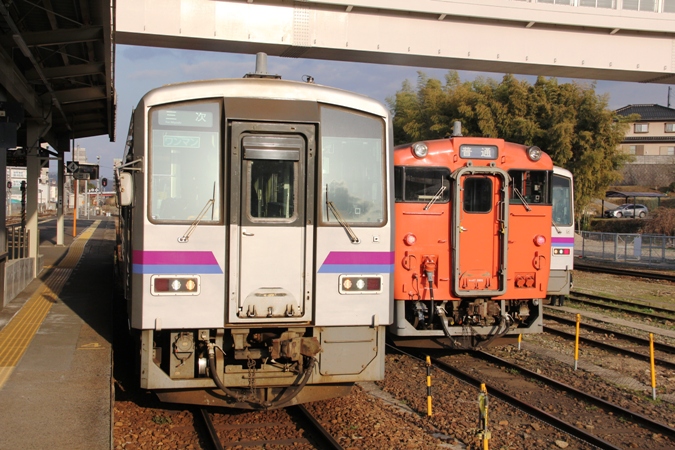 (左)キハ120-322 広ヒロ 1729D (右)キハ47-3005 広クチ/芸備線三次駅