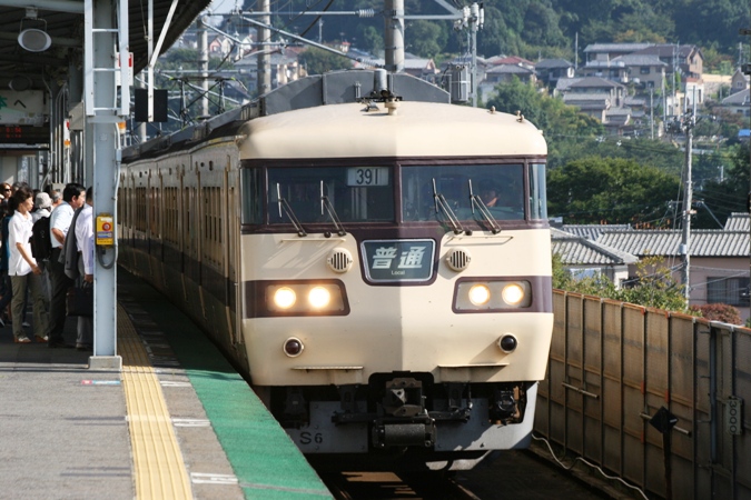 昭和54(1979)年に竣工し「シティライナー」として東海道・山陽本線筋で活躍した後、221系の投入に伴って福知山線等に転出。その後、岡山や下関地区へも転じた編成も出て、その地でローカル輸送に活躍しました。身勝手なもんで通学や通勤で普段使いしてた頃は狙わんかったのに、徐々に少なくなる国鉄型車輌を追い掛けながら、それらと一緒に走ってた117系も国鉄型と云うことで狙いました。