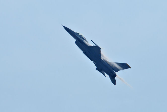 そして、米軍三沢基地デモフライトチーム所属のF−16Cがやって来ました。いつもの886号機です。この機体は主翼にパイロンが有りません。デモ専用機なんでしょうか・・・?相変わらずのハデな演技飛行は主翼上面にコントレイルをガンガン出しています。凄いですね〜。逆光でなければモット良いのですが・・・。