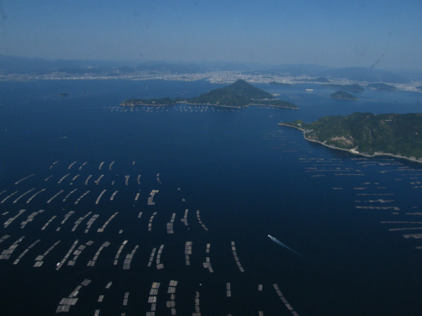 奥には広島市中心部、右手に江田島を望みながら、瀬戸内海の風景。