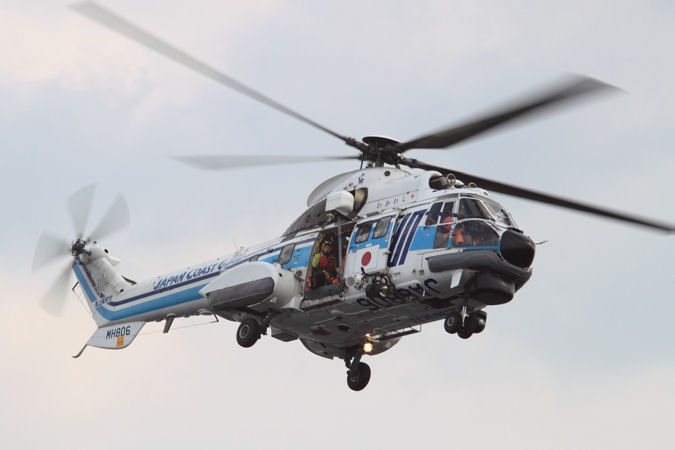 写真のように大型ヘリコプター・スーパーピューマが巡視船「おき」に着船することは「おき」の甲板の耐久性能上、本来ならば行われないものですが、今回はプログラムの都合上、訓練展示の一環として実施されました。なお、「おき」の改良型である「えりも」型以降では甲板の耐久性が見直され、大型ヘリコプターの着船も可能になっております。