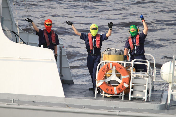 巡視船「らいざん」「びざん」「たかちほ」の3隻が波飛沫を上げながら向かって参りました。読者の皆様におかれましては、このような小型巡視船による追跡が「不審船対処」としてはもっとも浮かびやすい構図なのではないでしょうか。小型巡視船はその機動力・速力ともに最も優れているタイプであり、最前線での活動を約束されていると言っても過言ではありません。3隻による荒々しくも緻密な連携をご覧ください。