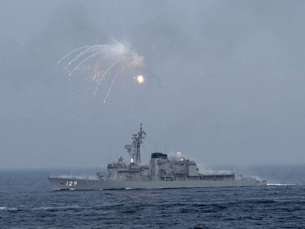 上写真は護衛艦「やまゆき」が、赤外線誘導弾ミサイルを回避するための、IRフレアーを発射するところ。
