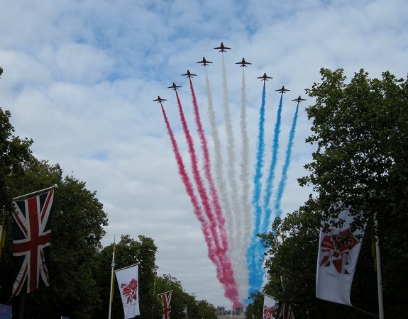 イギリス空軍90周年や、女王陛下の誕生日などのイベントの日にはこのようなフライパスト(儀礼飛行)を頻繁に行う。英国旗の赤・白・青のスモークを出しながら大通りを沿って低空飛行する。