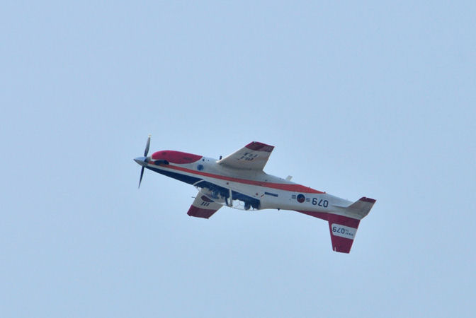 背面飛行のKT−1です。このサイズの機体でターボ・プロップ機ですのでイメージではT−7とダブってしまいます。