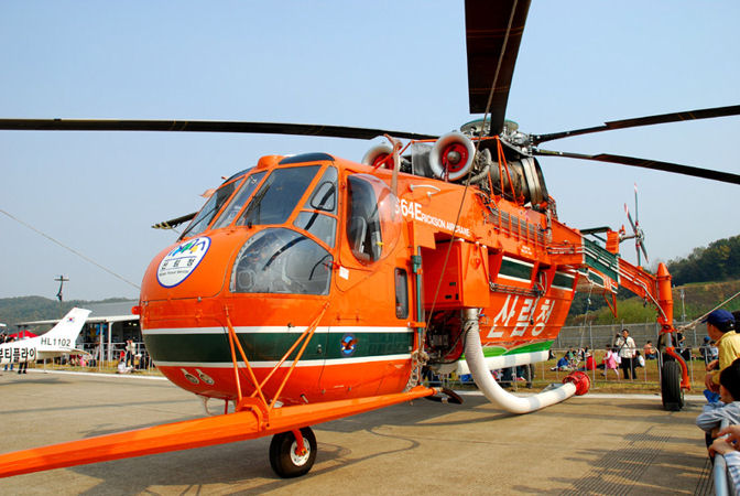 エリクソン・スカイクレーン社のS−64Eです。コンテナ運ぶだけの骸骨の様な機体が印象的でした。