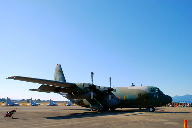 小牧基地第一輸送航空隊所属C−130Hハーキュリーズ(航空自衛隊イラク派遣用水色迷彩)。