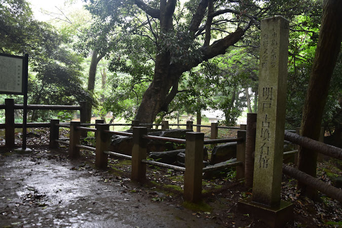 現在は主郭部が里見公園として整備されており、空堀や土塁が一部残っています。また、ここには元々、全長40mと推定される前方後円墳「明戸古墳」がありました。太田道灌が陣を構築する際に盛土を除去したため、露出した2つの石棺が、今も残っています。ちなみに、19世紀の天保年間に書かれた「江戸名所図会」にも石棺に関する記載があり、「一つは里見長九郎弘次の墓で、一つは正木内膳(ないぜん)の墓だという伝承もあるが、どちらも誤りで上世人(じょうせいじん/大昔の人)の墓だろう」と正しく推定をしています。