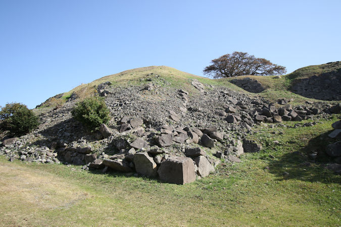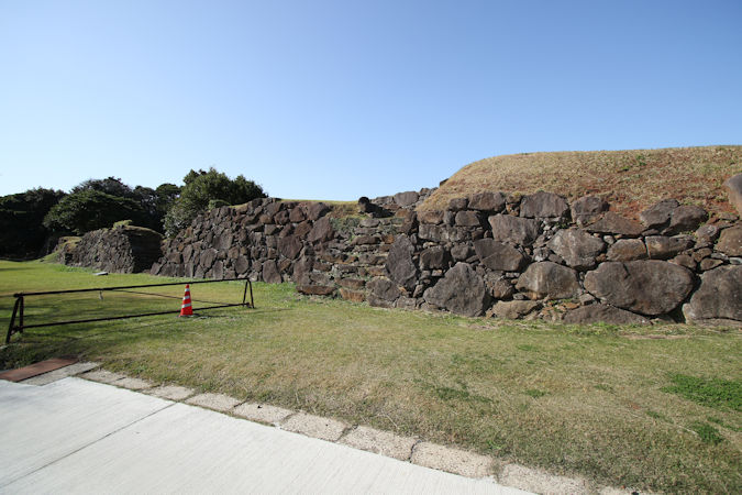 写真左上が本丸、二の丸方向。左の高石垣は馬場の櫓台です。なお、御覧のとおり馬場の石垣は破却によってV字型に崩されています。