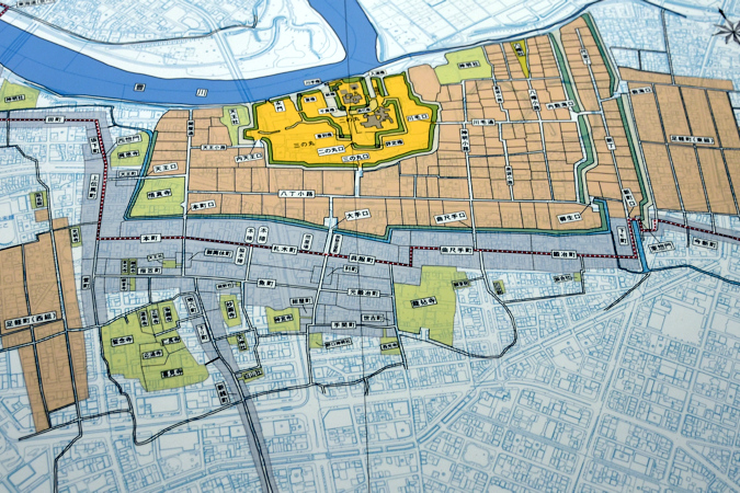 二川宿本陣資料館にて撮影。区画整理によって当時の町割りは大幅に改変されていますが、旧東海道は辛うじてたどることができます。城跡は本丸が残るほか、二の丸と三の丸の一部が残ります。