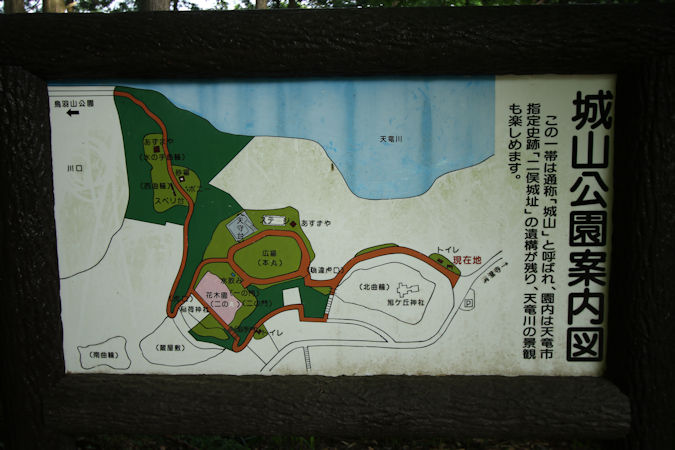 縄張りは北曲輪、本丸、二之曲輪、蔵屋敷、南曲輪を一直線に配置。本丸の南北に虎口を設け、北虎口は喰い違い虎口となっています。現在は天守台・石垣・土塁などが残っています。また、南西には二俣城の付城であった鳥羽山城跡があり、こちらも石垣が残っています。