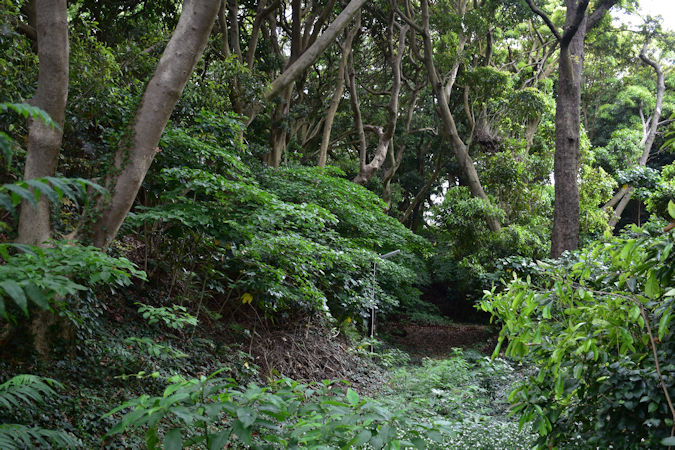 現在、新井城の敷地の大半は東京大学大学院理学系研究科附属臨海実験所となっており立ち入りできませんが、周囲に残る土塁や空堀を見ることができます。なお、南方約3kmの位置には三崎城があり、三浦氏時代には新井城と一体的な運用がされていたとも云われます。