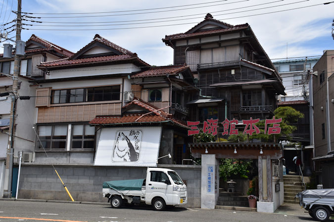 昭和初期の建築(戦後の改修あり)。三崎館本店は1908(明治41)年創業の割烹旅館で、PS2のゲーム「トロと休日」でトロが宿泊したお部屋もあります。