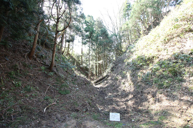 本丸と長屋敷を遮断するために尾根を人工的に掘削したもので、江戸時代終わりごろの古地図では関東橋と呼ばれる橋を架けていた様子が描かれています。