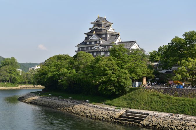 この地は元々、岡山、石山、天神山の3つの丘が連なり、南北朝時代の正平年間(1346〜69年)に、上神高直が石山に築城したのが始まりとされていますが、詳細は不明。戦国時代は金光氏が居城とし、1570(元亀元)年に浦上宗景の被官であった宇喜多直家が金光宗高を謀殺し、石山城を奪取。その3年後に本拠として整備します。近世の岡山城は1597(慶長2)年、宇喜多直家の息子で豊臣五大老の一人・宇喜多秀家が岡山に築城したのが始まり。天守閣は三重六階、織田信長の安土城天主閣を模して築かれたと伝えられ、全国的にも珍しい不等辺五角形の天守台です。また黒い下見板張りの外観から別名「烏城(うじょう」)と呼ばれ、金の鯱を挙げていたといい「金烏城」の名もあります。