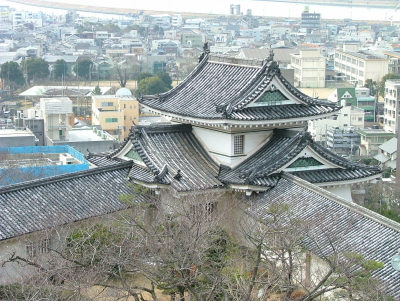 1958(昭和33)年再建。落雷で焼失した旧来の天守閣をモデルに1850(嘉永3)年に完成し、空襲で燃えた天守閣の外観復元で、三重三階と比較的小ぶりながら、一重目屋根には比翼入母屋破風、二重目屋根に唐破風などの装飾が。さらに隣には小天守も備えています。