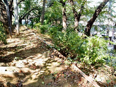 さて、西口を出で直ぐに左へ行くと、住宅・商業複合施設のアピレと大規模小売店舗の間に、小狭な自動車道路があり、東京の道にしては歩道もなく、車の相互通行も危ういこの道は、旧岩淵街道という古くから存在する交通路で、ここを少し進むと、かつては二件の古い旅籠が並んでいました。そして、旅籠と旅籠の間に小径があり、小さな地蔵尊が目印となっていましたが、残念ながら今はありません。その小径を行くと、急な階段にぶつかります。それが静勝寺こと、稲付城趾です。