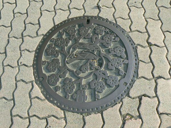 コメント:東京都青梅市のマンホール。市の花である「梅」と市の鳥「うぐいす」がかかれています。