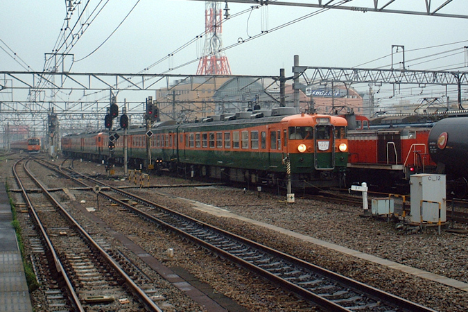 この日は湘南色に塗り直された、上沼垂運転所の165系・元「ムーンライト」編成を使用した急行「アルプス」を撮影。一緒に映っている車両は全て国鉄型。