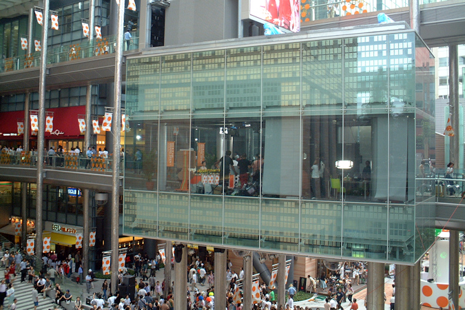 撮影時には写真中央に見えるガラス張りの場所で生放送が行われおり、福澤アナが、色々とこの新社屋と六本木ヒルズの解説・比較をやっておりました。また、色々と大道芸人によるイベントが行われていて、実につまらないモノから、なかなか面白いのまで色々やっていました。