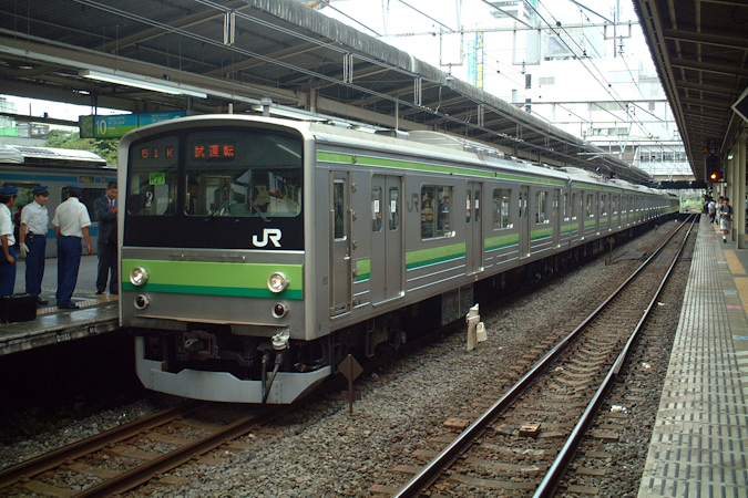 根岸線ホームでは横浜線の205系が試運転で出発待ち。