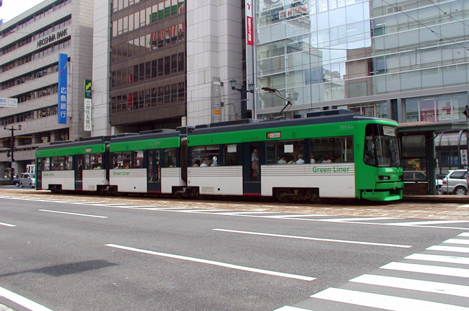 こちらは1901号。この付近は広島電鉄としては比較的狭い路地を走行しています。