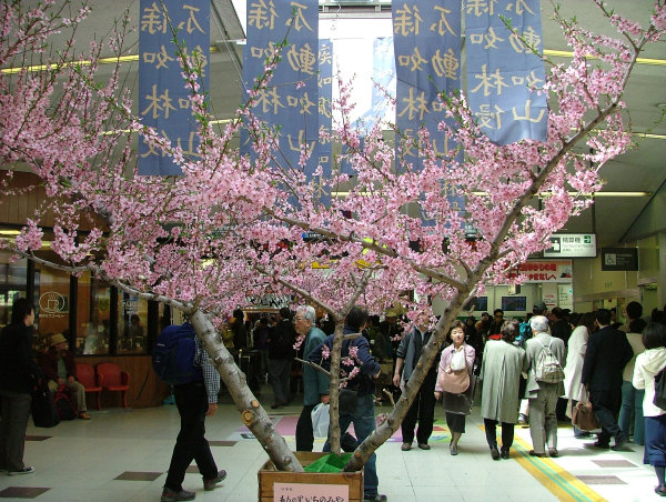 先々週、先週に引き続き、今週も大学時代の某友人と、今度は甲斐府中こと山梨県甲府市へ行ってまいりました。もちろん、本日開催される「信玄公祭り」が目当てです。ちなみに山梨県内の中央線沿線は桜はもちろんのこと、桃の花がまさに見ごろ。残念ながら、今回は桃の花の観賞をしにいくわけではないため見にいけませんでしたが、駅改札口に飾られている桃の木と花を撮影します。