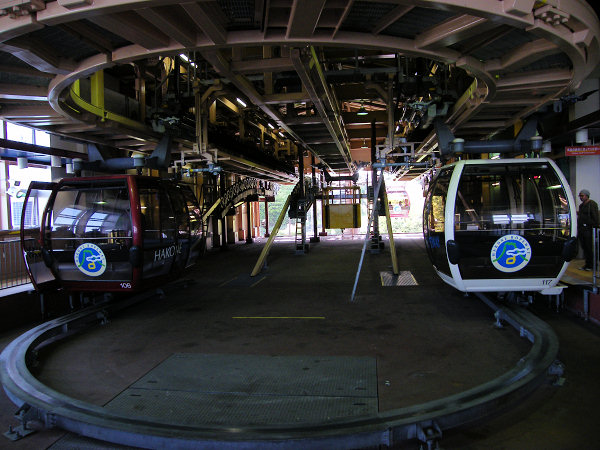 ケーブルカーから降りた大量の人がいなくなるのを待ってから、箱根ロープウェーに乗り換え。今度は今までの”すし詰め”状態から一転して貸切状態へ。