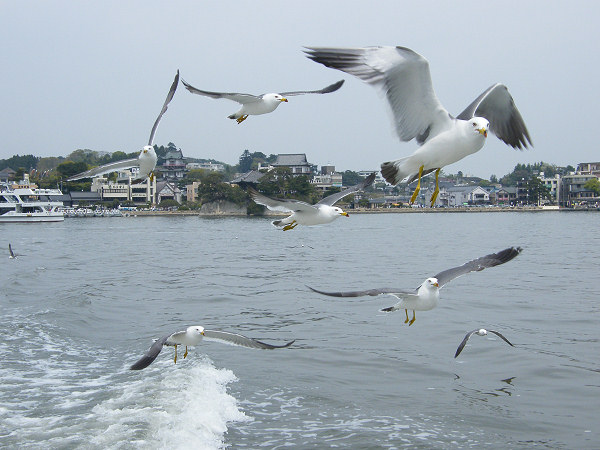 船が出港すると、「待ってました!」とばかりにカモメの大群が船にむけて襲撃をかけてきます。