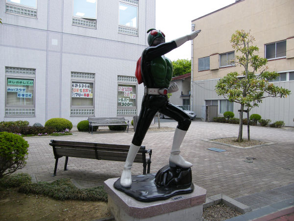 商店街に置いてあった仮面ライダーの像。町全体が、漫画作品の博物館と共に商店街振興を図る例としては、「ゲゲゲの鬼太郎」の水木しげる作品を前面に押し出す、鳥取県境港市の例がありますが、境港市は、駅から水木しげる記念館へ続く道を「水木しげるロード」と銘打って、半ばやり過ぎとさえ感じるほど、商店街のあちこちに妖怪のオブジェに、鬼太郎グッズ店があったりと、大変にぎやか。