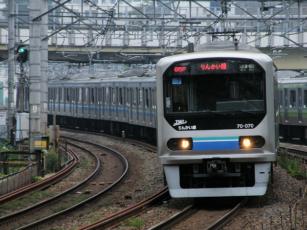 そして五反田駅へ帰還。ホーム新宿方の先で、ちょいと埼京線や湘南新宿ラインの列車たちを撮影。まずは、「りんかい線」の70−000系。