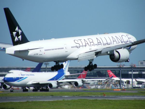 成田空港に着陸する直前の全日空スターアライアンス塗装。