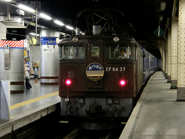 先週の成田撮影旅行の際、その場のノリと雰囲気で弊サイトのスタッフであるdaikitiさん親子の旅行を邪魔しに行くことにした、トンデモナイ所長&デュークのコンビ。眠い目をこすりながら上野駅に到着すると・・・なんと茶色のEF64牽引による寝台特急「あけぼの」が到着済でした。思わぬ収穫に大満足。幸先の良いスタートです。