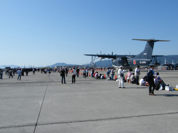 さて、本日のメインイベントである海上自衛隊岩国航空基地に到着。ここで鉄の鳥さん、さらに私は初対面となるSAJI さんや、カジボーさんの知り合いである大学の偉い教授の方と合流。まず目に入ってきたのは、救難飛行艇「US−2」の3号機。