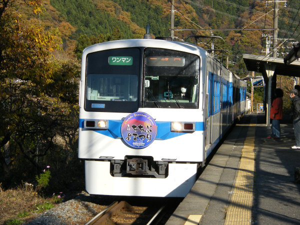 「ちちぶよまつり」ヘッドマーク付きの6000系電車を撮影。前面にLEDによる愛称表示機もついていますが、やはり集客の面でヘッドマークが付いているか、付いていないかは大きな違いのようです。