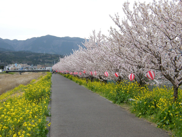こちらは対岸の「幸せ道」の様子。こちら側のほうが菜の花の組み合わせが見事な様子。ちなみに春木径には101本、幸せ道には70本の春めき桜が植えられているそうです。