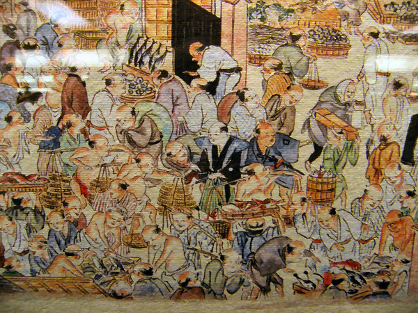 日本橋の近くでは、魚を運んだり売ったりする人が所狭しと描かれています。今でこそ魚市場と言えば築地ですが、徳川家康が江戸に入府してから関東大震災に至るまで、魚市場は日本橋にあり続けていました。それにしても、道のド真ん中で堂々と商売しちゃうのですね。