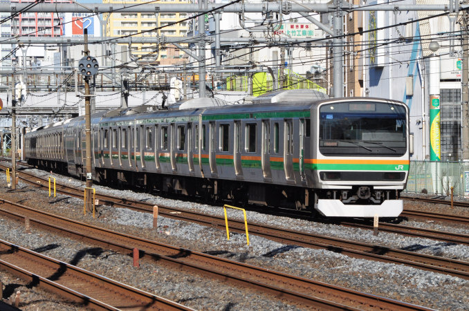 逆光やビルの影に悩まされますが、E331系はバッチリ撮影完了。