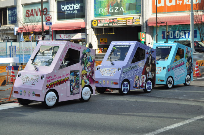 続いて秋葉原のヨドバシカメラで、秩父路号さんへの土産を確保。秋葉原駅に行こうとしたら、こんなかわいい車が来ました。ミルキィホームズという美少女探偵アニメのPSP用ゲームの宣伝だそうです。そんな作品があるとは私は全然知らなかった・・・。