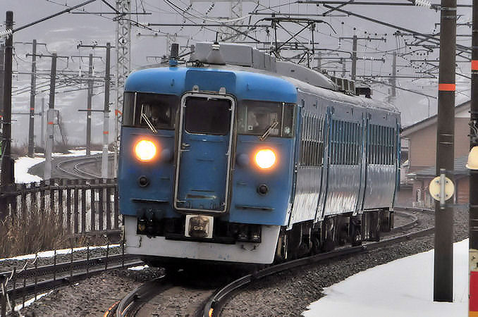 北陸本線の多くの列車は直江津駅の片隅から発車していきます。青一色になったばかりの413系に遭遇。うむ、何とダサい。