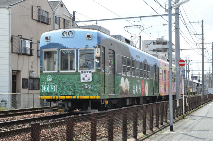 上下列車の離合シーン。この西大路三条駅から山ノ内駅間は路面電車区間となっており、なかなか撮影も乗車が楽しい区間です。