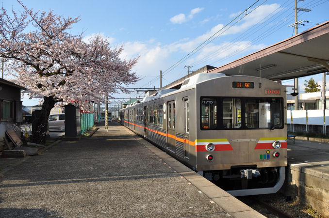 ホームの桜と1000形。