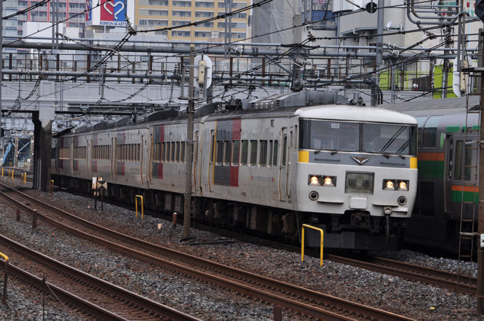 この日まず、山手線の鶯谷駅に到着し少々撮り鉄を行います。目的はタイトルにあるとおり、ニコニコ超会議号。・・・と、いきなり183系臨時快速「足利藤まつり」号に遭遇。全く想定していませんでしたが、何とか後追い撮影は成功しました。 今後は651系の波動用転用も予測される中、来年も183系で運転されるのか要注目の列車の1つです。