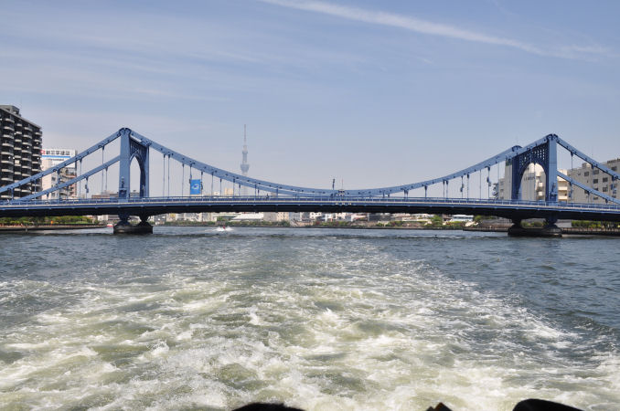 船の後ろから上流側に向かって橋を撮影します。というわけで、船の進行方向とは逆向きになる、という前提で写真をお楽しみください。まずは、吾妻橋。赤く塗られ、浅草寺を意識したデザインが素敵ですね。