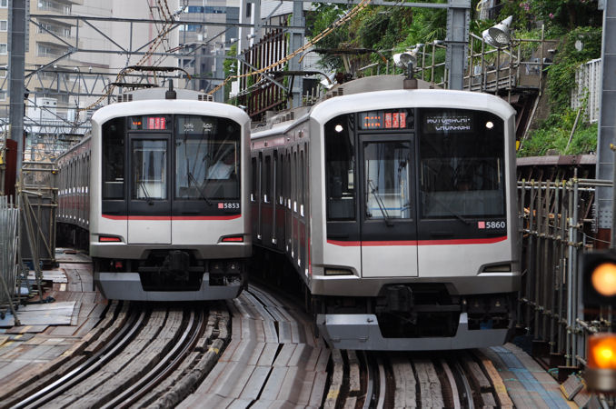 そこへ、東京メトロ03系も姿を現します。日比谷線は東横線と副都心線の直通運転開始後は東横線に乗り入れてこなくなるので、この離合はかなり貴重。