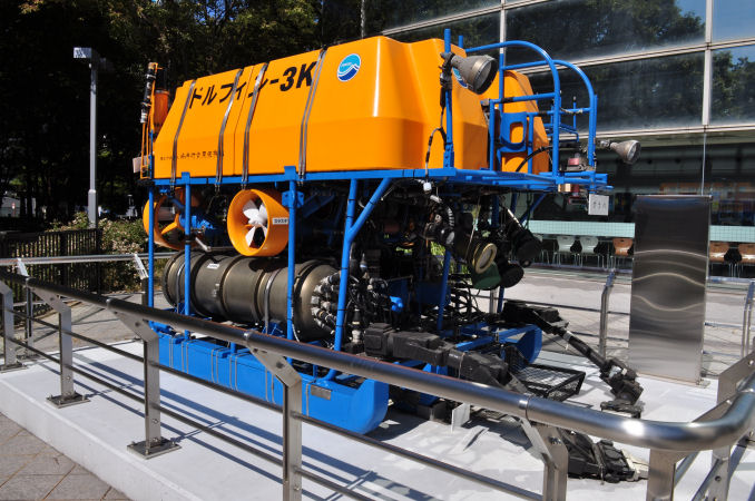こちらの機械は海洋無人探査機ドルフィン3K。1987(昭和62)年から2002(平成14)年まで使われたもので、主に日本近海でメタンハイドレートや天然ガスなどの資源調査、深海生物の調査、地震の調査などに用いられました。 現在は後継機のハイパードルフィンに役割を譲っていますが、こうした調査を通じて日本近海は資源の宝庫だと判明してきたわけで、これは楽しみですね。