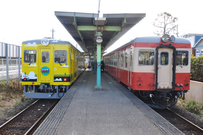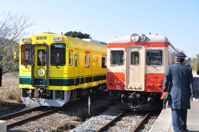 国吉駅の観光駅長が見送る中、キハ52形の脇を通る、いすみ300形を撮影。駅の人がいると、引き締まった感じがしますね。