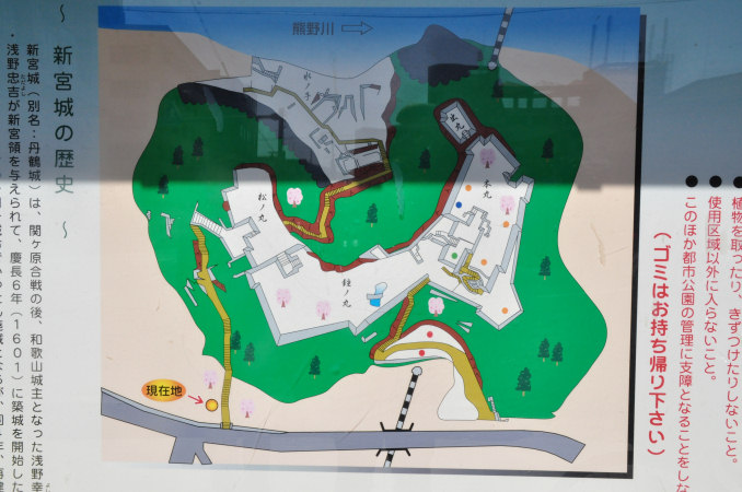 その後、徳川頼宣が紀州藩主(紀伊徳川家)になると、その付家老である水野重仲が新宮城主となり、水野氏の居城として明治維新を迎えました。建物は何も残っていませんが、石垣はご覧のとおり。